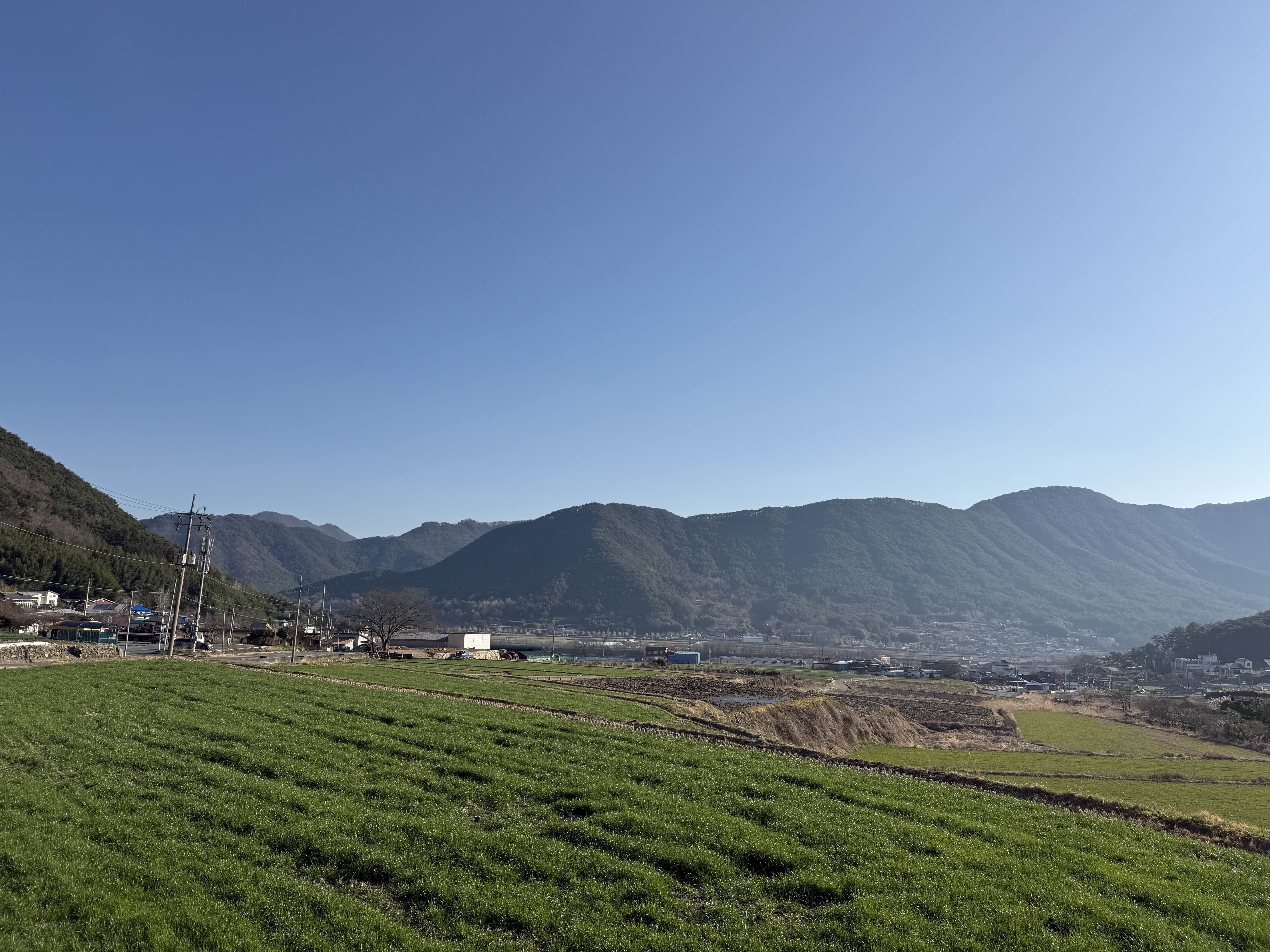 봄이 찾아온 푸르른 대지와 쏟아질 듯한 고랑 모양으로 솟은 산.